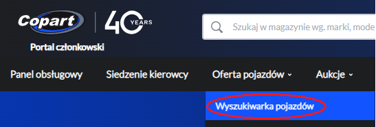 Następnie klikamy na zakładkę “Oferta pojazdów” gdzie wybieramy “Wyszukiwarka pojazdów”: