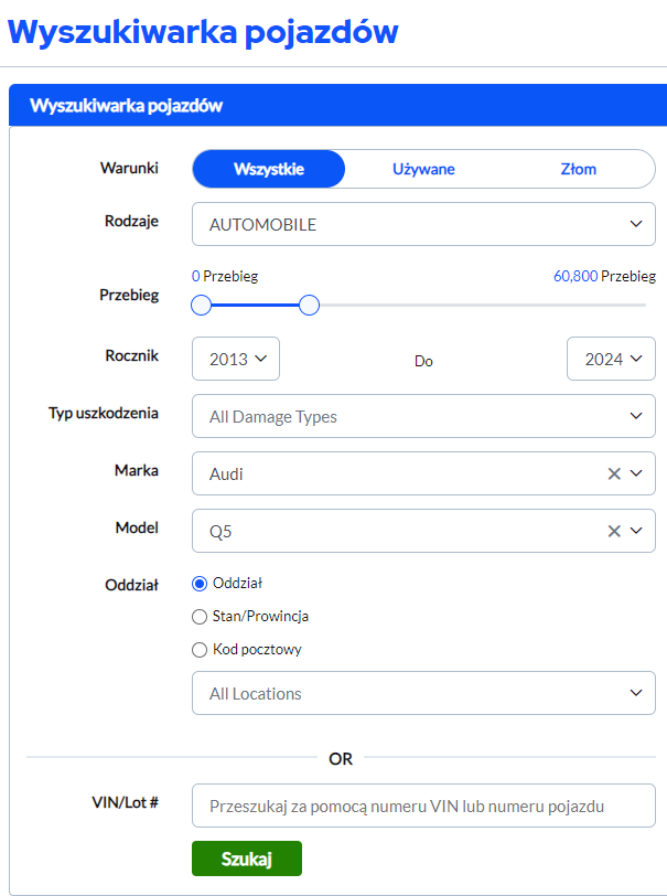 Następnie w wyszukiwarce pojazdów określamy: