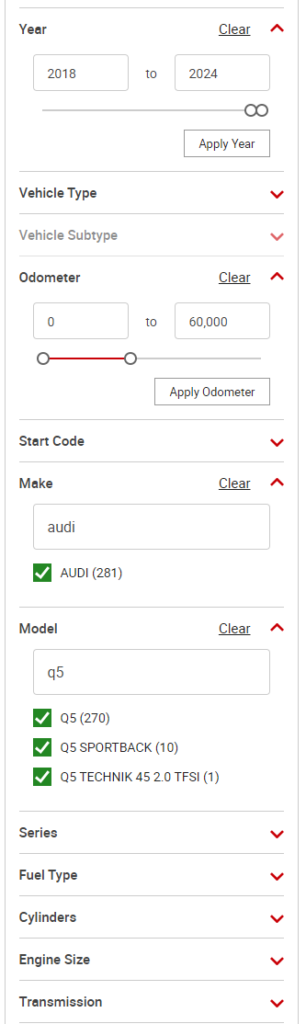 Wyszukiwarka IAAI jest niestety mniej intuicyjna niż Copart na tym etapie, aczkolwiek najważniejsze dla nas będą: