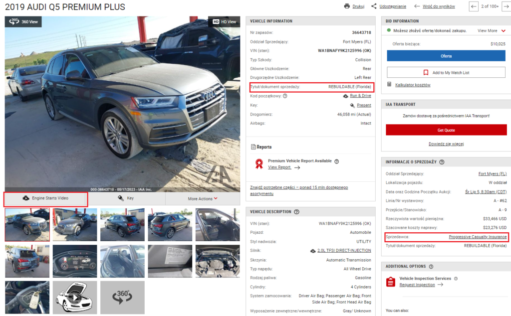 Po otwarciu aukcji naszym oczom ukażą się detale pojazdu, m.in. tytuł własności oraz dane sprzedawcy (w wielu wypadkach dane te nie będą publiczne, jednak jesteśmy w stanie doradzić czy auto pochodzi od ubezpieczalni, czy rąk prywatnych). Warto również sprawdzić nagranie z pracy silnika.